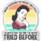When Choosing Between Two Evils I Always Pick The One I've Never Tried Before. This retro sarcastic funny quote accessory makes a great gag gift for a man or woman who have a reputation for bad decisions or being a troublemaker, and love sarcasm. Funny saying design for anyone who loves to get into mischief with their friends, likes going to a party, getting into trouble or drinking together. Perfect for anyone with a sassy sense of humor. Features an innocent looking woman set against a sunset.