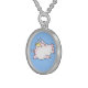 This is the most charming pendant of Sandra Boynton's when pigs fly. Of course, it is slightly humorous but it also is a positive statement about what we can accomplish. It is very comfortable to wear, not to heavy. It has a lovely shine. I just love it! There was no printing on the necklace.