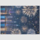 This variation deepens the sense of celebration by adding reflection and symmetry. A glowing city skyline stretches along the edge, mirrored in calm water, while fireworks bloom overhead in radiant bursts of gold and white. Confetti drifts across the night sky, catching light like scattered stars.