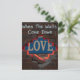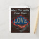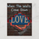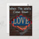 This design captures a powerful metaphor for revealing a hidden truth. It features a weathered brick wall with a jagged opening, through which the word "LOVE" is partially visible and glowing with a warm, red light. The phrase "When The Walls Come Down" is written in a light graffiti style on the brick, symbolizing the moment we choose to reveal what has been hidden.