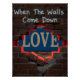 This design captures a powerful metaphor for revealing a hidden truth. It features a weathered brick wall with a jagged opening, through which a sign with the word "LOVE" is partially visible. The sign has a clean, bold style with a warm, red glow. The phrase "When The Walls Come Down" is written in a light graffiti style on the brick, symbolizing the moment we choose to reveal what has been hidden.