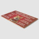 This image features a red doormat with the text "WHEN VISITING MY HOUSE PLEASE REMEMBER" at the top. Below, there are several lines of text. On the left side: "IF YOU DON'T LIKE DOG HAIR STAY OFF THE SOFA," "I LIVE HERE YOU ARE THE GUEST," and "YOU WILL BE SNIFFED & POSSIBLY LICKED DEAL WITH IT." On the right side: "TO YOU I AM THE DOG BUT HERE I AM THE BABY," "THEY LIKE ME MORE THAN THEY LIKE MOST HUMANS," and "THEY LOVE ME THEY'RE ONLY FRIENDS WITH YOU." In the center is a smiling Corgi dog wearing a red and white patterned scarf. The doormat is placed on a tiled floor.