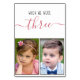 A modern, more original way to personalize your table numbers with childhood photos of bride and groom at that number age (the default is one).The placeholder photos of a little girl (the bride) and a little boy (the groom) are in black frames, in the lower half. In the upper part, there is the message "when we were three" with the age written in a pink (dusty rose) handwriting script and the rest above, in smaller black caps (hand letters).