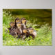 A delightful brood of mallard ducklings look out from their soft grass nook beside a quiet pond.