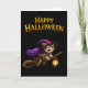 Send some perfectly magical wishes this season with our magical witch kitten soaring greeting card this adorable design features a cheerful tabby kitten dressed in a purple witches hat and Cape flying through the night on a broomstick with a glowing lantern set against a clean deep black background with bold vintage style Halloween lettering this card captures the sweet and whimsical side of the holiday. It's the ideal choice for cat lovers's children or anyone who enjoys a touch of charm with their spooky celebrations high quality and ready for your personal message. This card is a heartwarming way to say happy Halloween