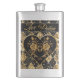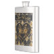 A whimsical and romantic goth label to turn an ordinary flask into a Valentine's Love Potion featuring an elegant heart with golden roses on a dramatic black and gold harlequin pattern background and rich gold letters.
