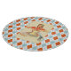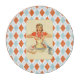 Fun colorful glass cutting board done in aqua blue, orange, and white argyle pattern background. Cute retro art, in the middle, shows a comical house wife making dough. Customize to add any text you want. Great gift idea.