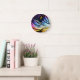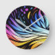 This wall clock, has a colorful design of feathered brush strokes in a slight butterfly design.