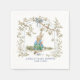 Whimsical Beatrix Potter napkins featuring Peter Rabbit under a blooming floral arch with delicate pink flowers, lush greenery, a sweet bow, and gentle pastel tones—Peter holds his carrot in iconic style! Custom text: "AMELIA'S BABY SHOWER JUNE 23" in refined blue script. Great for spring garden parties, nursery-themed events, or timeless baby showers. Soft, durable paper that feels special, matches your invite set perfectly, available in multiple sizes with Zazzle’s reliable quality and fast printing.