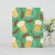 Whimsical pattern of mugs of beer and skewered brat sausages on green background. Perfect for Octoberfest and backyard BBQ themes