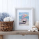This whimsical digital download features a watercolor painting of a black cat wearing glasses, lounging in a large seashell on a sandy beach. Rendered in soft pastel pink and blue tones, the scene includes gentle ocean waves, a colorful umbrella, and the warm sun in the background. Delicate details throughout the artwork add charm and personality, making it a perfect choice for coastal decor lovers or cat enthusiasts seeking a lighthearted, imaginative touch.