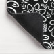 This unique pattern features stylized spiral flowers and simple leaf accents. The dense white design sits on a clean black background, creating a whimsical and graphic look. This pattern is modern, fun, and eye-catching, with a cool, flowing style.