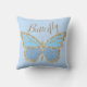 Girly and cute whimsical butterfly throw pillow. Blue background. The butterfly is in two shades of blue with a gold glittery-style outline. Above it is the word Butterfly in a pretty typography script with the "fly" portion of the word going upward like a butterfly taking flight.