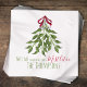 Merry Mistletoe with white berries tied up in a red ribbon nestled atop a doorway awaiting those to stand underneath. A lovely and simple design that depicts a simple and classic Christmas element. A wonderful design for any holiday occasion.