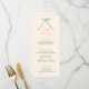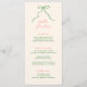Whimsical bridal shower menu featuring a beautiful hand drawn bow in a fun and playful style, accompanied by a casual, handwritten font in a fun color scheme of green and coral. This menu can be customized with the guest's name.