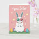 This card features a friendly white rabbit centered on a blush-pink background, standing upright on a thin strip of bright green grass while wearing round glasses with one emerald lens and one coral lens 🐰. A necklace of small, multicolored beads rests at its neck, adding a sweet, social touch like it’s dressed up to meet someone special. Near its feet sit four decorated egg shapes in sunny yellow, soft lavender, warm rose, and cool cerulean, each dotted with tiny patterns and little floral marks that feel like a shared springtime project. Across the upper area, small pastel hearts in cream, pale yellow, and light blue drift around like gentle hints of affection between friends. The overall look stays soft and cozy, with smooth textures and calm colors that make the scene feel easygoing and welcoming 🌷. A flowing phrase is placed above the rabbit in a darker coordinating tone, standing out clearly against the pink. The hearts are scattered mostly near the top edge, leaving open space around the text and framing the rabbit’s glasses and ears.
