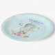 Adorable paper plates for a baby shower, birthday or other event with a whimsical vintage flair. Designed with a charming illustration of a little bunny riding along in a hot-air balloon decorated with a fancy pink ribbon, along with some flowers and butterflies. A pastel blue watercolor background gives it a dreamy feel.