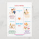Guide your guests through your big day with this playful and organized itinerary card featuring charming illustrations. The design showcases digital watercolor icons of a bride, groom, cake, and balloons in a vibrant palette of red, emerald green, and peach. Easy to customize with your specific event times, names, and date.