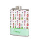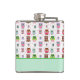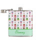 Fun lady's drinking flask, with cute cartoon graphics of colorful pink, green, and brown owls and polka dots, on a white background. A mint green band, across the bottom, has green text ready to personalize. Cute gift idea.