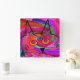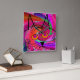 Whimsical Cat Art Clock, artist drawn cat face with big eyes on a background of multiple shads of pink, purple, orange and green tones.
