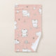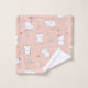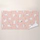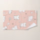 Hand drawn cats in various poses with fish bones, yarn and paw prints on pink background