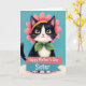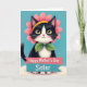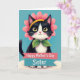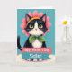 This card shows an adorable black-and-white cat centered on the front, with big lime-green eyes that seem to gaze gently at the viewer ❤️. A small pink nose and light rosy cheeks add a sweet, affectionate look, and fine whiskers soften the face. On its head sits a many-petaled pink flower like a crown, bringing a friendly, caring mood to the scene. Under its chin, a bow tie shaped from two green leaves adds a natural touch, as if it dressed up just to make someone smile. The background is a calm pastel blue, keeping the focus on the cat and its tender expression. Near the bottom, two layered banners hold the message, with “Happy Mother’s Day” in white on a coral pink banner and “Sister” in white on a teal blue banner 🌼. The cat’s dark fur contrasts strongly with the pale blue background, and the pink flower stands out above its ears.