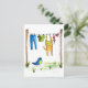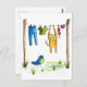 This is an original watercolor painting of a whimsical cat hanging on a clothesline.