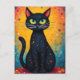 This captivating postcard features a charming black cat with mesmerizing green eyes that seem to gleam with curiosity and playfulness. Its pink nose and delicate whiskers add a delightful touch, while the intricate patterns on its fur create a textured and artistic appeal. The backdrop bursts with energy and vibrancy, showcasing an enchanting mix of warm yellows and oranges alongside soothing blues, adorned with whimsical flowers and stars that infuse the design with a magical, dreamlike quality. This cute postcard is perfect for sending notes or greetings to cat lovers or art enthusiasts.