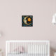 The image is a square canvas print with a black background. In the center of the canvas, there is a crescent moon with a face of a sun on the left side. The sun is facing towards the right side of the image, with its eyes open and its mouth slightly open. The background is filled with swirls and patterns in various shades of blue, green, and orange. There are also small orange and yellow stars scattered throughout the image. The overall style of the print is whimsical and dreamlike.