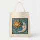 A whimsical celestial sun and moon and stars tote bag for shopping and other activities.