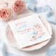 This whimsical wedding napkin features a charming illustrated dinner-table scene with soft pastel watercolor florals, a glowing candle, a delicate rococo vase, and a sweet slice of cake on a plate. Hand-drawn details in blush pink and soft blue create an airy, romantic palette with a playful, artful feel.
