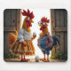 Two comical chickens dressed in human clothes stand inside a rustic barn doorway with one holding an egg