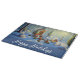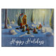 Fun Holiday glass cutting board features whimsical and surreal Christmas forest scene with snow capped trees, created with AI generating software. "Happy Holidays" text on blue background is customizable. Fun as a Holiday party charcuterie board too!
