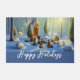 Fun Holiday front doormat features whimsical and surreal Christmas forest scene with snow capped trees, created with AI generating software. "Happy Holidays" text on blue background is customizable.