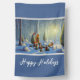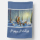 Fun holiday season house flag features whimsical and surreal Christmas forest scene with snow capped trees, created with AI generating software. "Happy Holidays" text on blue background is customizable.