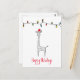 Whimsical hand drawn giraffe illustration with red Santa hat, a string of holiday lights and customizable "Happy Holidays" text