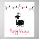 Whimsical black goat illustration with red Santa hat, a string of holiday lights and customizable "Happy Holidays" text