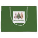 Minimalist watercolor christmas tree gift bag with playful leopard pattern in earthy green and gold. Personalize with your custom name for a stylish Christmas gift presentation.