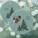 Imagine a charming photo ornament hanging on the tree that captures the magic of the holidays. Delightful ornament showcasing a whimsical green tree surrounded by soft white snowflakes. The tree, embellished with delicate strands of snow, stands gracefully against a soothing blue-green backdrop, exuding a warm and inviting atmosphere. The ornament features a playful greeting, wishing warmth and joy for the holiday season. Beautifully captures the enchanting spirit of Christmas.