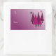 A modern design featuring whimsical Christmas trees in shades of purple on a shaded purple background. Little snowflakes accent it.