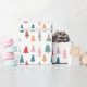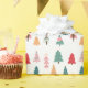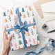 Festive Christmas wrapping paper, with a whimsical pattern of colorful trees.