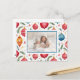 Your friends and relatives will smile when they receive your Christmas postcard that features the family photo along with this whimsical ornaments design. The pattern is cute with its bright, cheery holiday colors of red, blue, and yellow in a vintage watercolor. Pine tree bough wisps and Yuletide ephemera are part of the scene. The text is in red typography, including "Merry Christmas" on the reverse of this postcard, and can be edited. You can keep, change, or delete the suggested paragraph sentiment. Be sure to edit the example family and individual names to the ones you intend as well as the date or leave them out if you want this side of the postcard to be blank.
