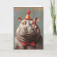 A humorous and charming portrait of a hippo dressed as a clown, featuring a red bow tie and a colorful party hat. Perfect for adding a playful touch to any space or creative project.