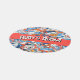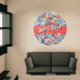 Colorful abstract illustration with bold colors in navy, sky blue, orange, coral red, and white bordered by black curved lines. Whimsical and fun hand-drawn style