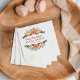A cheerful painted floral wreath in coral, blush, and golden yellow with lush greenery frames the bride's monogram name and bridal shower details in warm calligraphy on these whimsical wedding napkins. The vibrant, hand-painted blooms bring a fresh, garden-inspired feel to any spring or summer wedding bridal shower or bridal luncheon.