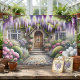 This enchanting scene captures the essence of a storybook cottage garden, bursting with lush blooms and cascading wisteria in soft purples, pinks, and whites. A charming arched wooden door welcomes you through a stone path framed by flowering shrubs, manicured greenery, and dreamy light filtering through the foliage. The overall mood is peaceful, romantic, and full of secret garden nostalgia—perfectly aligned with cottagecore and fairytale aesthetics. The composition draws you inward, evoking a sense of wonder and serenity beneath the floral canopy. AI generated artwork.