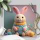 A soft, playful, cuddly knitted bunny in pastel colors with tiny yarn eggs, perfect for Easter greeting cards and spring holiday decor. The design is charming and plush, with a handmade feel and bright, warm, friendly appeal.