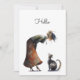 A cute cat and a lady share a Hello on this whimsical card. All text can be changed to your preferred greeting. AI assisted graphic purchased with commercial use. Artwork: RedHeronLighthouse