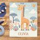 This cute personalized baby blanket features a whimsical adorable giraffe in a beautiful savanna surrounding.