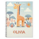 This cute personalized notebook features a whimsical, adorable giraffe in a beautiful savanna background.